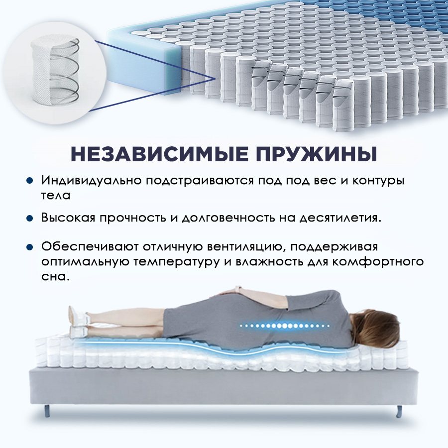 Основа ортопедического эффекта. Каждая пружина работает изолированно, обеспечивая точечную поддержку разных участков тела. Вы не почувствуете движений партнера, а ваш позвоночник получит идеально ровную поддержку. Блок способствует отличной циркуляции воздуха.