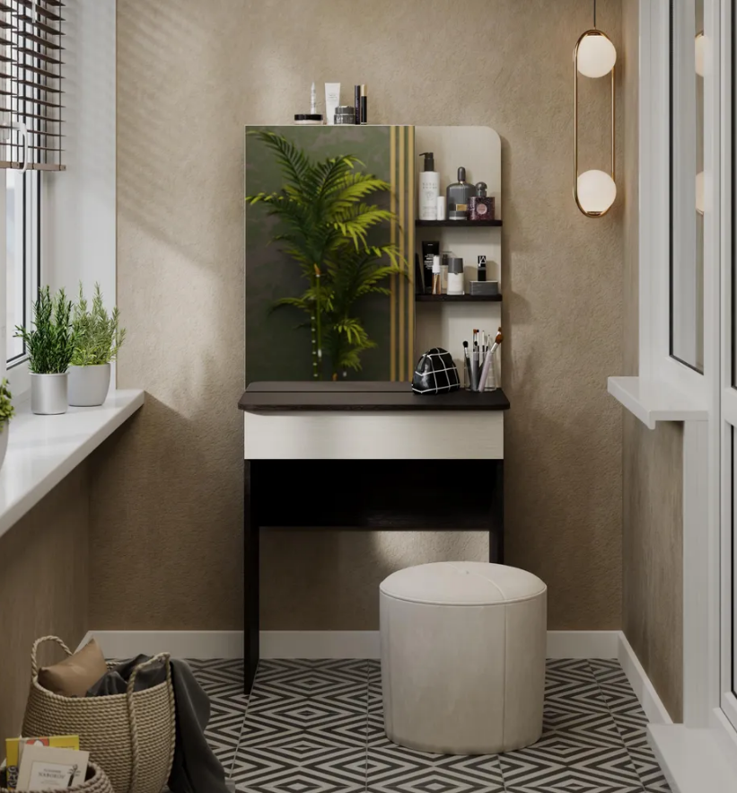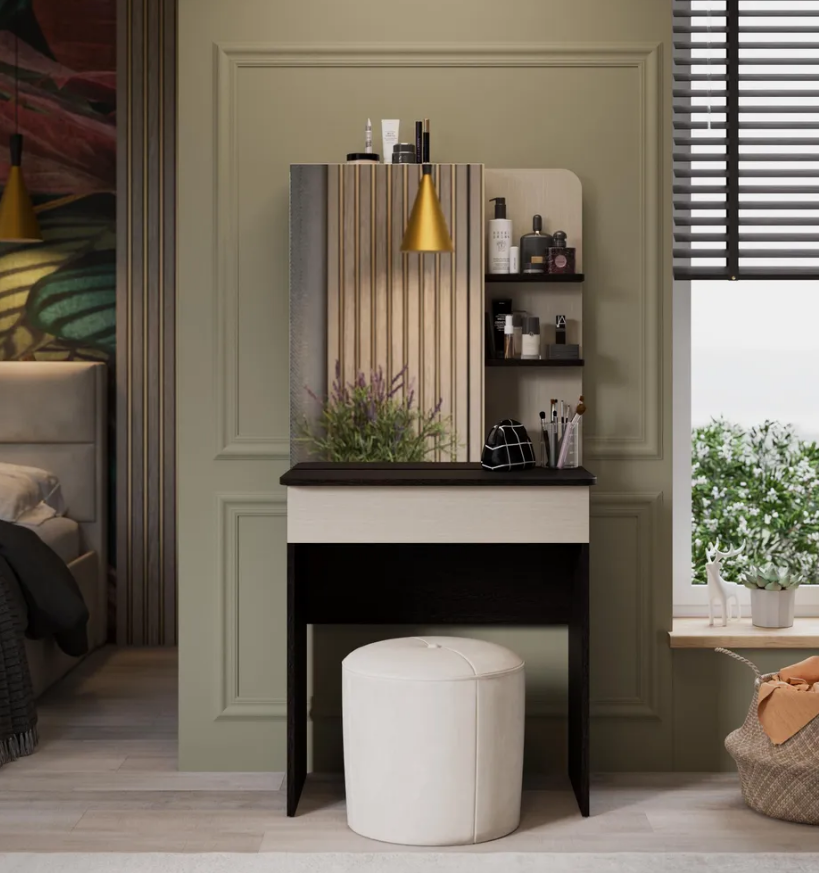 • Стол туалетный «Майя» отличается плавными линиями и универсальными текстурами, которые создают основу для дальнейшего оформления комнаты в различных стилях. Наличие открытых и скрытых полок, зеркала представляют собой главные атрибуты современного туалетного столика.
